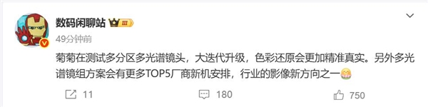 从爆料来看,多家厂商都将跟进多光谱镜组方案,届时各大品牌的影像色彩还原能力将会更强。