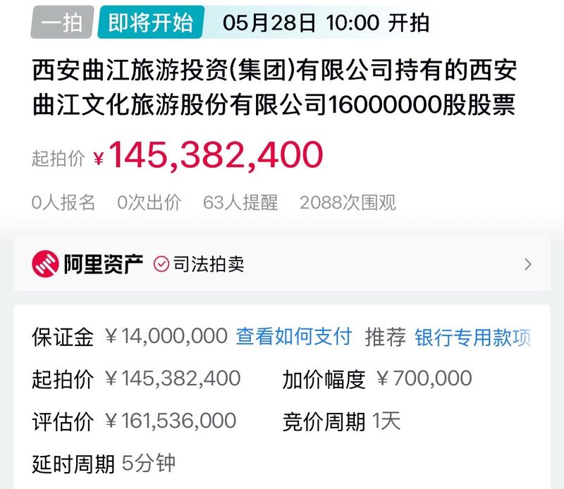 5月6日,曲江文旅公告显示,控股股东所持1600万股无限售流通股拟被拍卖,占公司总股本6.27%,目前处于冻结状态。这部分股份的起拍价1.45亿元,拍卖时间为2025年5月28日10时至5月29日10时(延时除外),平台为西安市雁塔区人民法院淘宝网司法拍卖网络平台。