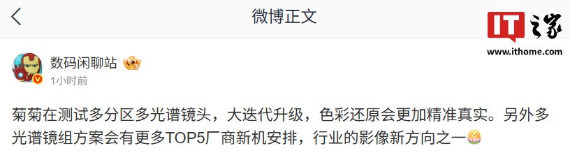IT之家 8 月 13 日消息,博主 @数码闲聊站 今日发文透露,华为正在测试多分区多光谱镜头,大迭代升级,色彩还原会更加精准真实。另外他表示,多光谱镜组方案会有更多 TOP5 厂商新机安排云南配资,行业的影像新方向之一。