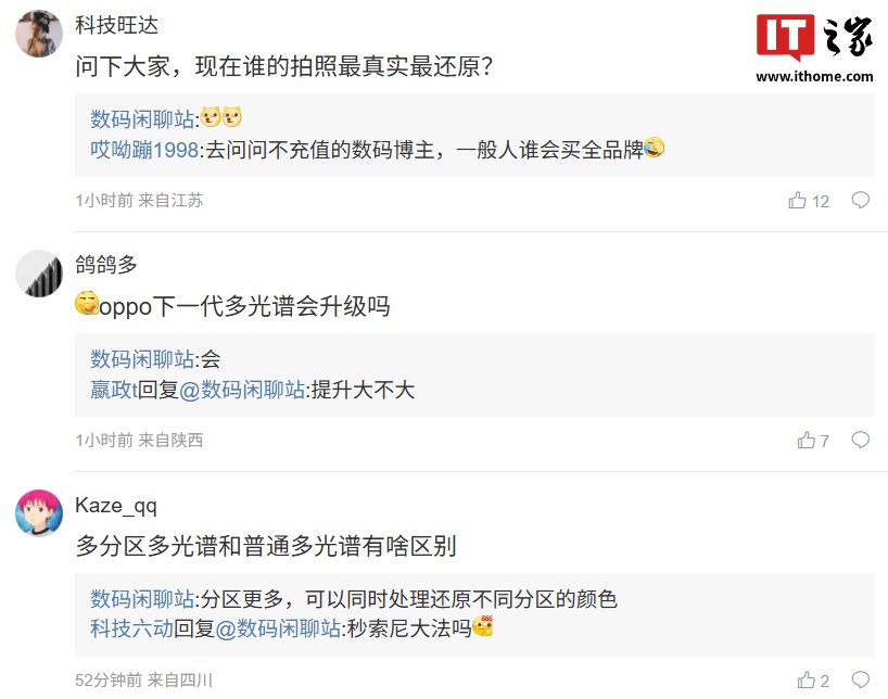 博主还在评论区答疑解惑:针对 OPPO 下一代是否会升级多光谱镜头,博主回复“会”;针对多分区多光谱和普通多光谱有什么区别,博主表示“分区更多,可以同时处理还原不同分区的颜色”。